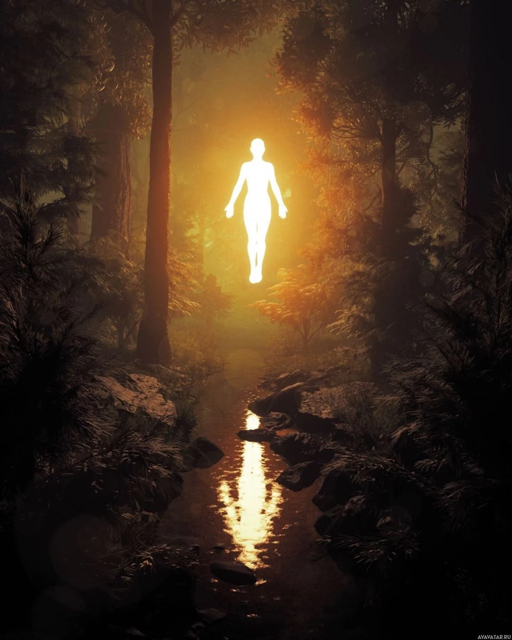 На картинке изображен силуэт человека, стоящего в туманном лесу, на фоне которого что-то похожее на источник света создает эффект привидения. Вокруг деревья и скалы, что наводит на мысль о естественной, возможно, мистической обстановке.
