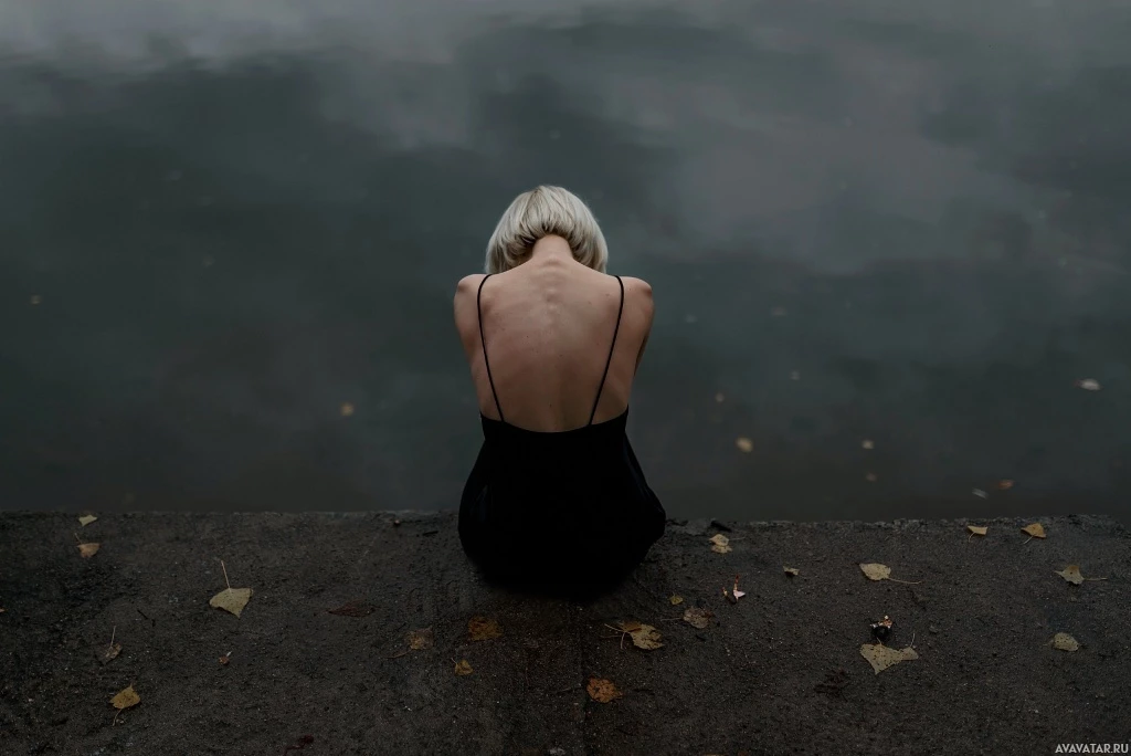 a concrete edge or ledge by the water. It is a silhouette, which suggests that the individual's back is turned to the camera. There are leaves scattered around the area, indicating it might be