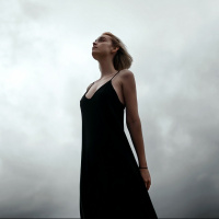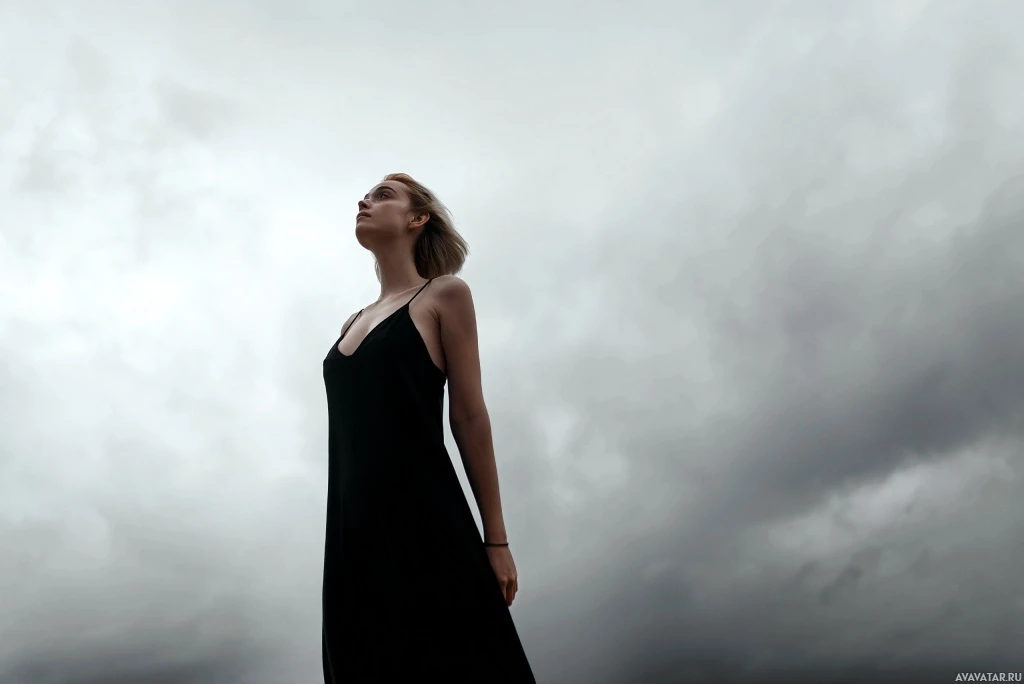 sleeveless dress that reaches her mid-calf and has a high neckline. Her hair appears blonde, and she's looking upwards, seemingly towards the sky or clouds, with her arms gently outstretched at her sides. The background suggests an overcast day with