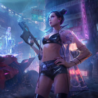 neon lights, suggesting a futuristic or cyberpunk environment. There are also elements of a motorcycle and
