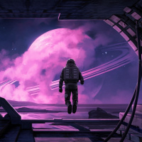 a space platform or dock with two planets in the background. The artwork has a purple hue and features a fantastical or