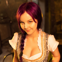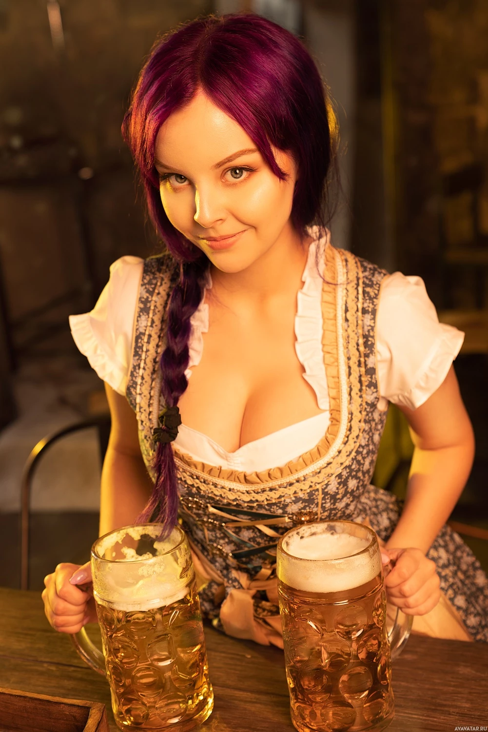 a young woman with pink hair styled in braids. She is wearing traditional German attire, consisting of a dirndl, which includes a bodice,