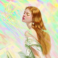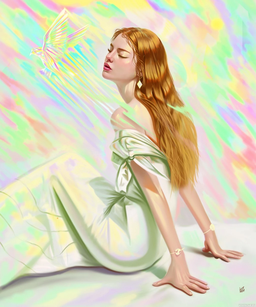red hair. She is depicted from behind, with her eyes closed, giving off a serene or meditative vibe. The background is colorful and bright, which contrasts with the girl's