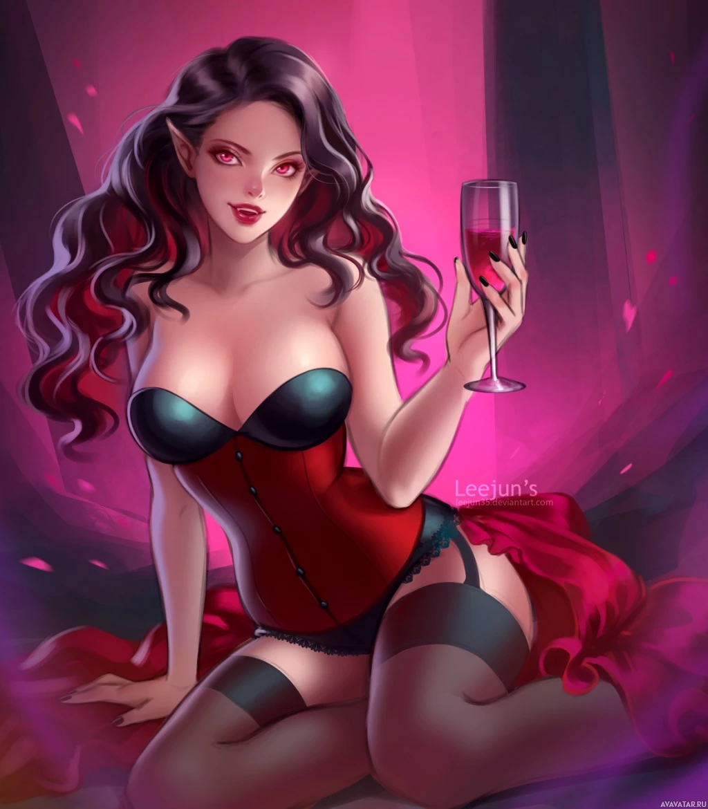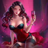 a wine glass, which could be interpreted as a symbol of seduction or elegance often used to enhance the allure of characters in fantasy narratives. The background has a dark and moody atmosphere, further emphasizing the vampire theme.