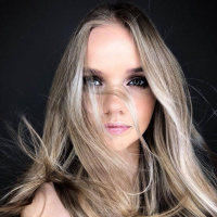 The image features a woman with light-colored hair. Her makeup is done in a manner that accentuates her facial features, and she appears to be wearing a blouse or top that has some sort of