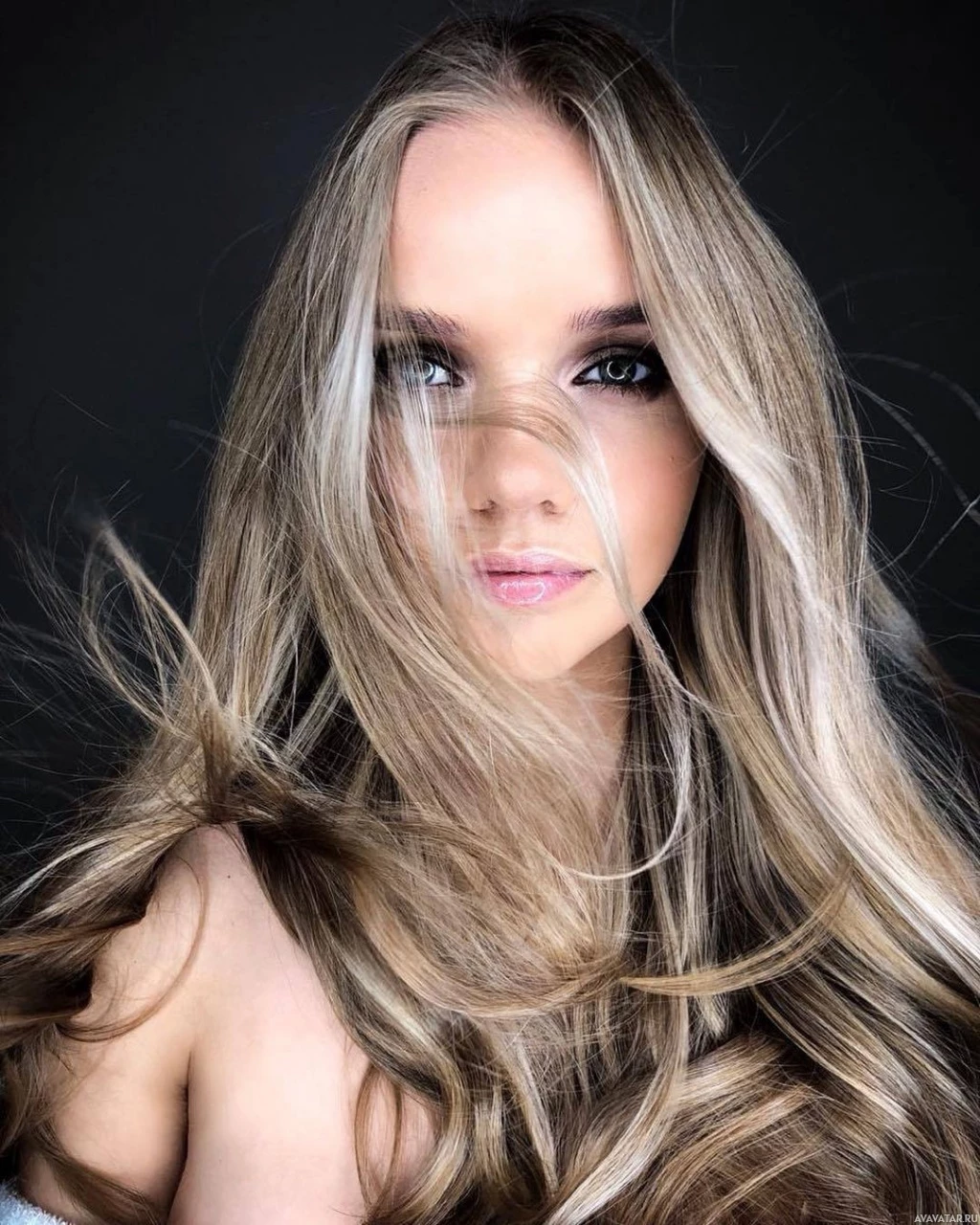 textured pattern. The wind is blowing through her hair, adding motion to the photo.