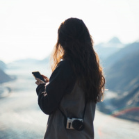 a body of water such as a lake or bay, possibly during sunrise given the soft lighting in the background. The girl is using her phone, which seems to be a smartphone based on its design and size. Her attention appears to be focused on the device she's holding, suggesting that she might be texting, browsing, or using an app. The