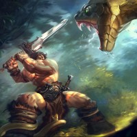 an action pose or ready for combat. He's facing towards the right side of the image. On the left side, there is a snake coiled up with its mouth open, possibly in