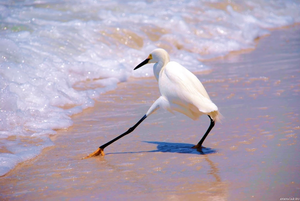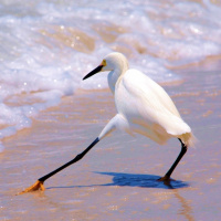 a white bird, commonly known as a sandpiper or shorebird, walking on a beach near the water's edge. It appears to be in motion with one leg raised and the other trailing behind, which is typical of birds that walk along shorelines to search for food. The bird has