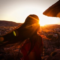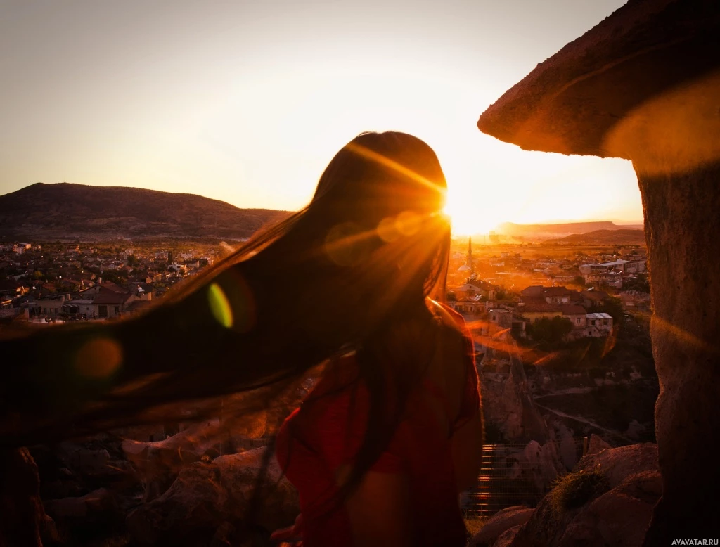 The image shows a person standing at a vantage point, looking out towards the sunset over