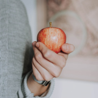 The image shows a person holding an apple with one hand. The hand is visible in the foreground, while the rest of the body is partially blurred out. There's a painting or artwork on the wall behind the person, but specific details about the scene are not provided.