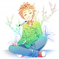 The image shows an animated character who appears to be a child with closed eyes, smiling broadly. They are sitting cross-legged on the ground and holding their chin with one hand, as if deep in thought or enjoying a pleasant moment. The background features colorful blossoms, which adds a cheerful and whimsical atmosphere to the scene.