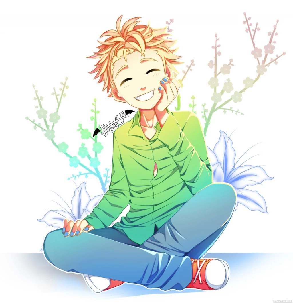 На картинке изображен анимационный персонаж, похожий на широко улыбающегося ребенка с закрытыми глазами. Они сидят на земле, скрестив ноги и подперев подбородок одной рукой, как будто глубоко задумались или наслаждаются приятным моментом. На заднем плане изображены яркие цветы, которые придают сцене веселую и причудливую атмосферу.