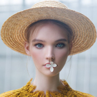 a fair complexion, wearing a yellow hat and a garment that appears to be a dress with a floral or patterned design. She is also holding a small