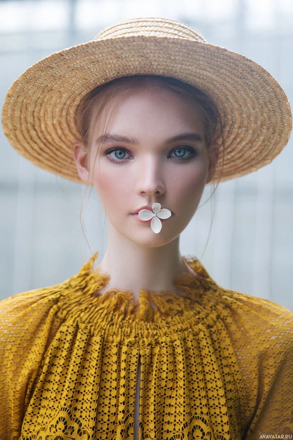 white flower near her mouth. Her makeup is subtle but enhances her natural features, such as the blue color on her eyes, which could suggest contact lenses or