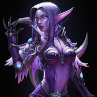На картинке изображен женский персонаж из жанра фэнтези, известный как "дроу". У нее фиолетовая кожа и она одета в доспехи с замысловатыми узорами. Персонаж изображен в уверенной позе, одна рука лежит на бедре, а другая слегка поднята над головой. Выражение ее лица кажется решительным или напористым.