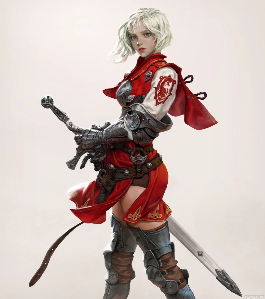 pieces of armor and weapons, including a sword and shield. Her pose suggests she is ready for battle or combat.