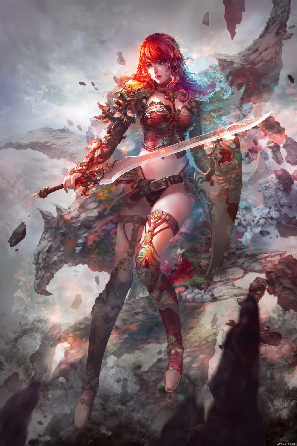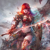 the midst of battle or combat. Her attire suggests she might be a knight or a similar type of fighter. The background has an artistic and dynamic feel, with splashes of color that give it