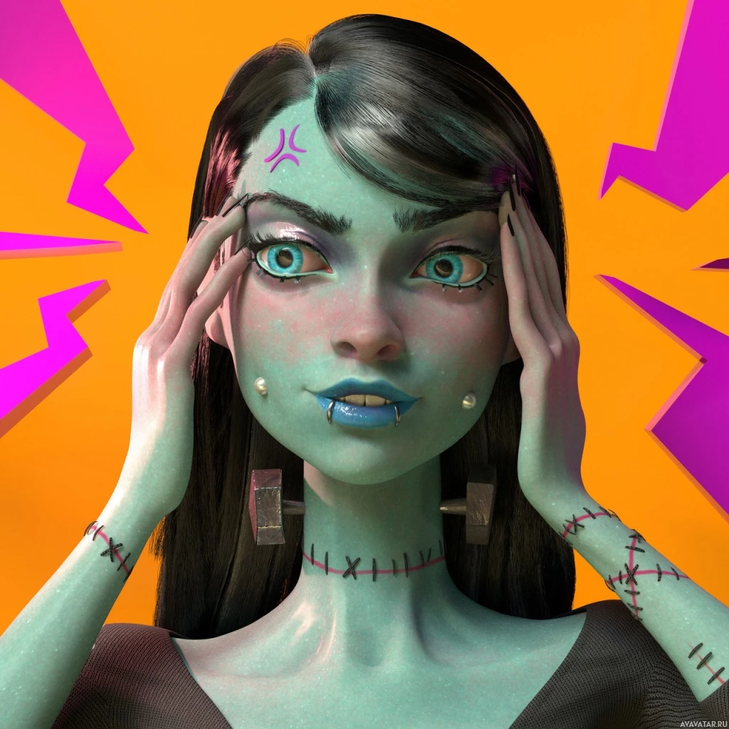 blue lipstick and her expression is one of distress or anguish, with her hand placed against her forehead in a gesture that suggests she might be feeling overwhelmed or experiencing intense emotions. The background is vibrant with
