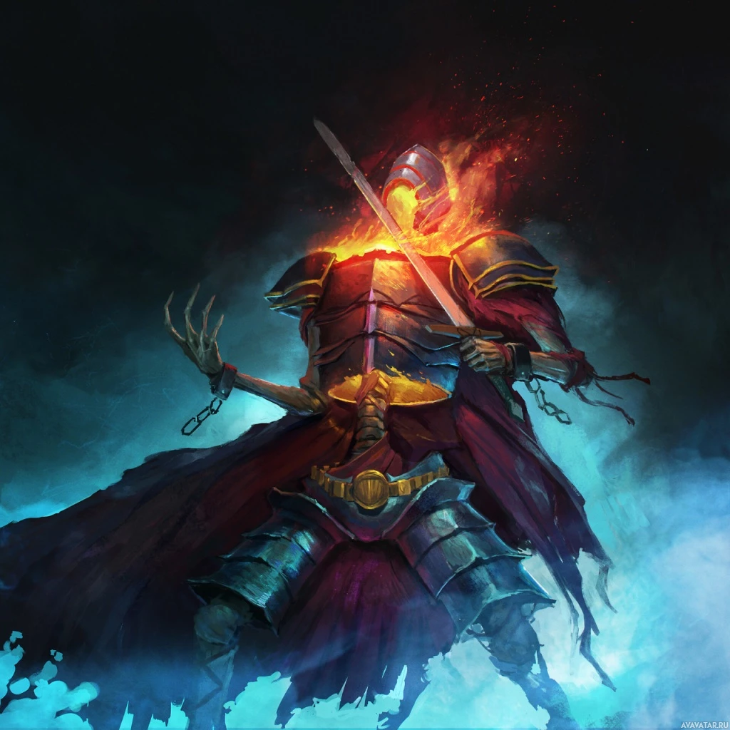 a character of significance within the narrative context of the artwork. Flames are visible around the sword and the upper part of the body, adding to the fiery,