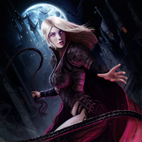 The image depicts a fantasy character, possibly representing a vampire or a similar mythical creature. She is wearing a cloak and holding a staff, with a moon in the background. The setting appears to be a dark, gothic-style environment, which fits the typical aesthetic associated with such characters.