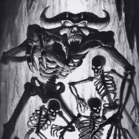 several skeletons that appear to be either being attacked or participating in some sort of ritual or combat situation. The setting appears to be a dark,