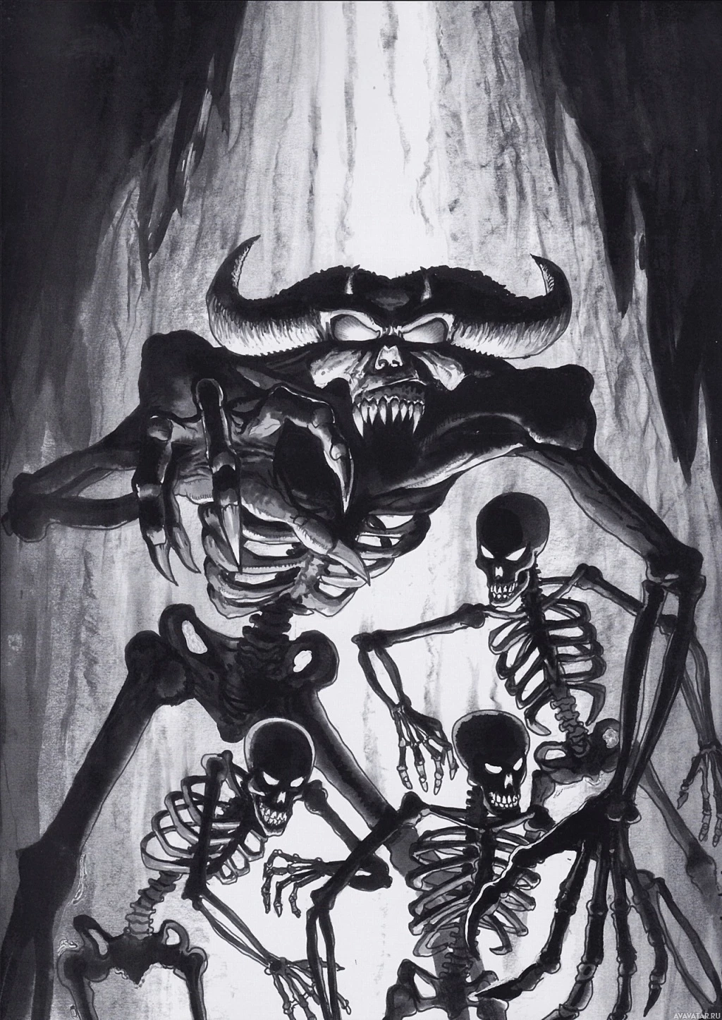 a fantasy scene featuring a large, menacing creature with horns and a muscular build. This creature is surrounded by