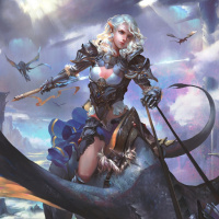 mythical beast. She is equipped with armor and holds a bow in her hands, suggesting she may be a warrior or huntress. The setting appears to be an imaginative landscape filled with rocks, water, and other elements typical of