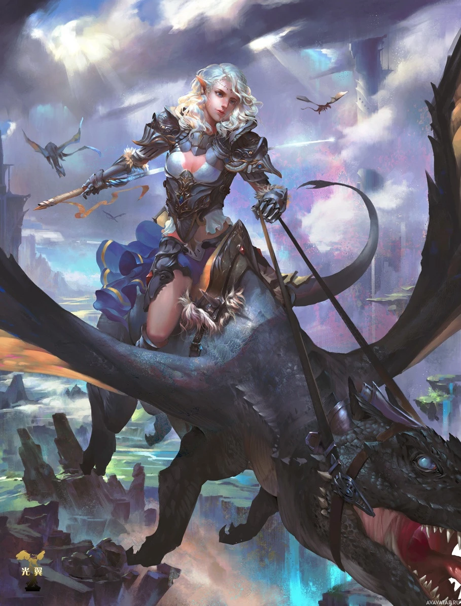 a fantasy scene featuring an elven character. This character is riding on the back of a large, aggressive-looking creature that resembles a dragon or a similar