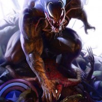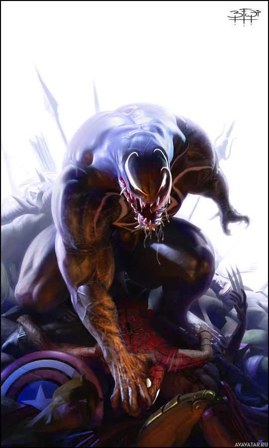 the Venom symbiote, which is known for its association with Spider-Man's nemesis. This creature is clad in a black and white armor with