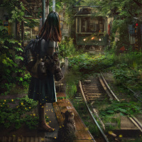 railway track. She is wearing a backpack and seems to be accompanied by a cat that is looking at the camera. They are surrounded by vegetation that has overgrown the tracks, suggesting a post-apocalyptic or nature-reclaimed setting. The atmosphere is quiet and serene, with no sign of