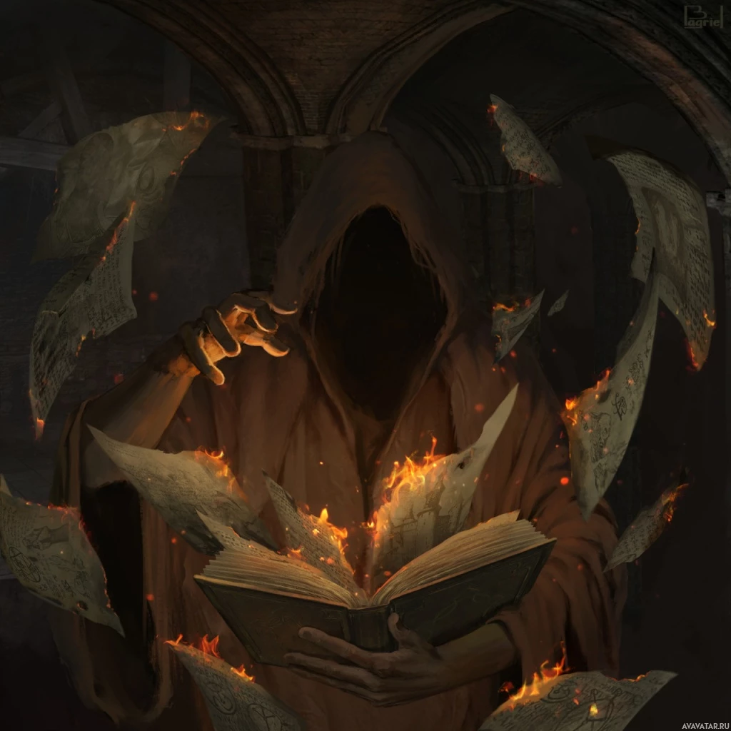 an open book with flames emanating from it and other pages floating around as if being propelled by magic. The setting looks like a dungeon or an old, mysterious library, contributing to
