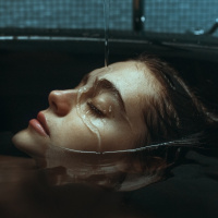 The image shows a person lying in water, likely in a bath or spa setting. The individual's eyes are closed, and they appear to be relaxing or experiencing a sensory-