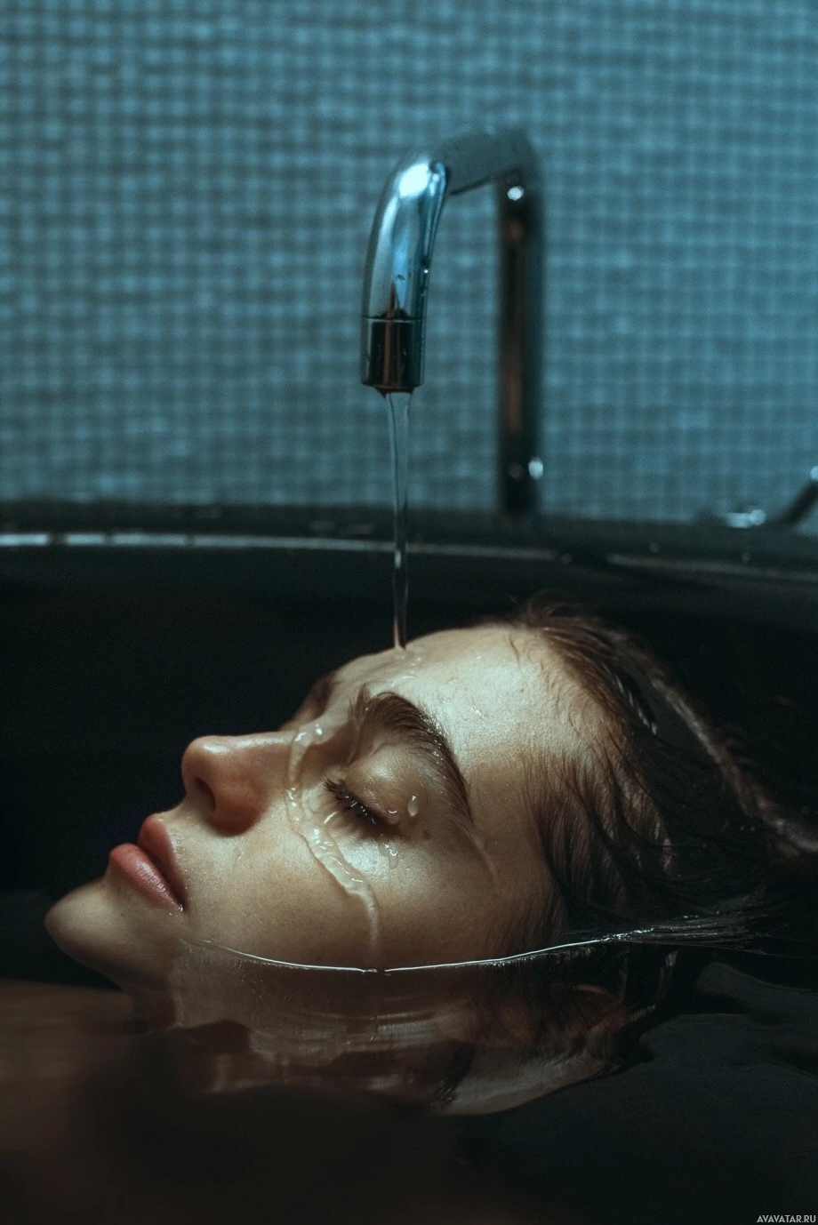 rich environment, possibly a skincare or wellness activity given the context provided. There is also a visible stream of liquid, which could be water or another fluid, pouring onto their face from a faucet, suggesting that they might be having a facial treatment or simply enjoying a soothing