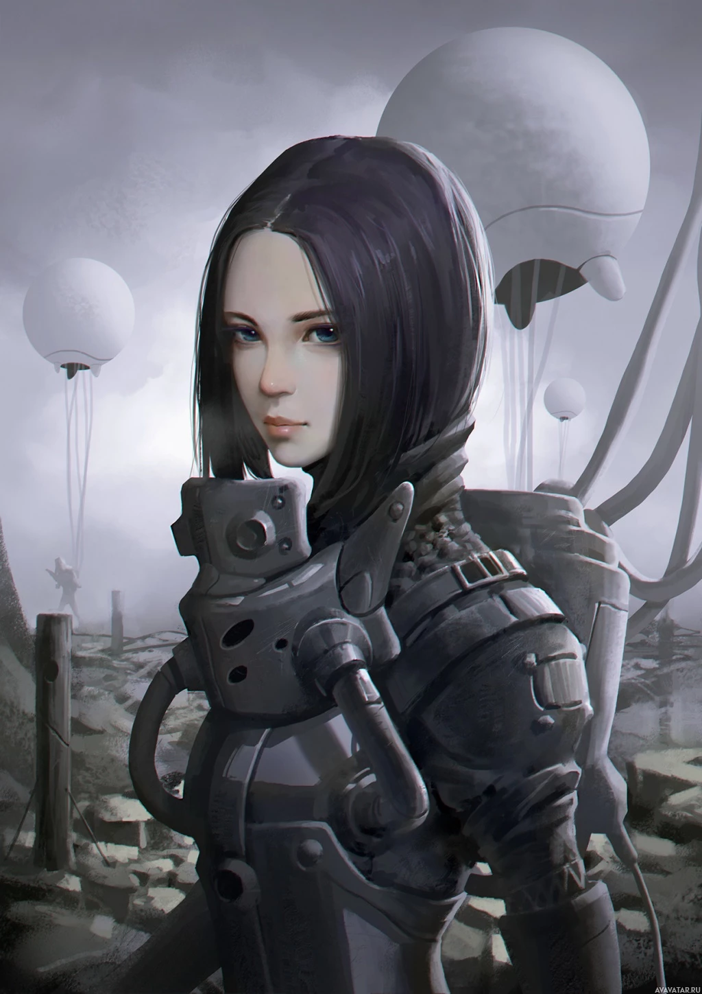 a science fiction-inspired outfit, which includes armor that covers her torso and shoulders. There are futuristic elements such as a helmet or headgear with what seem to be