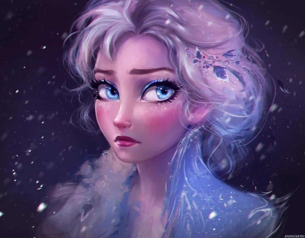 На картинке изображен анимационный персонаж, известный как Эльза, центральная фигура диснеевского анимационного фильма "Холодное сердце". Она изображена со своей легендарной ледяной силой и длинными светлыми волосами. На заднем плане изображена зимняя заснеженная обстановка, которая соответствует обстановке в Эренделле.