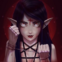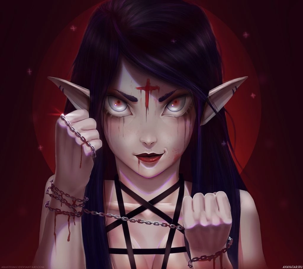 fantasy genres. Her expression is intense and somewhat menacing, suggesting she might be a villain or anti-hero. The background is dark with a red hue, and there's a stylized cross on her forehead, possibly indicating that she has some connection to a religious or symbolic figure within