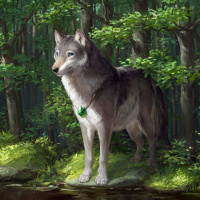 The image shows a wolf standing on the bank of a stream surrounded by trees. The wolf appears to be in a natural setting, possibly a forest or a wilderness area. It's a detailed and realistic painting that captures the essence of the animal in its habitat.