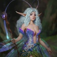 a mystical forest or grove, which complements the theme of the character's role as a fairy or enchanted creature.