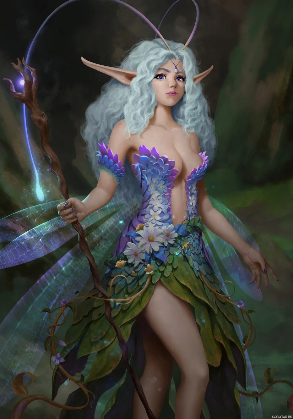 a fantasy character with white hair, dressed in a fairy-like outfit. She has pointed ears characteristic of an elf or fairy and is holding a staff that could be magical in nature, given its