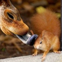 The image shows a giraffe and a squirrel interacting closely. The giraffe appears to be reaching its
