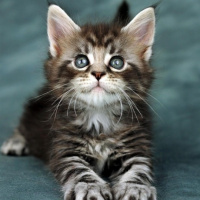a domestic cat of the tabby variety, characterized by its striped coat pattern. The kitten is sitting upright and looking directly at the camera, giving it a curious and alert appearance. This image showcases the beauty of this