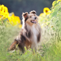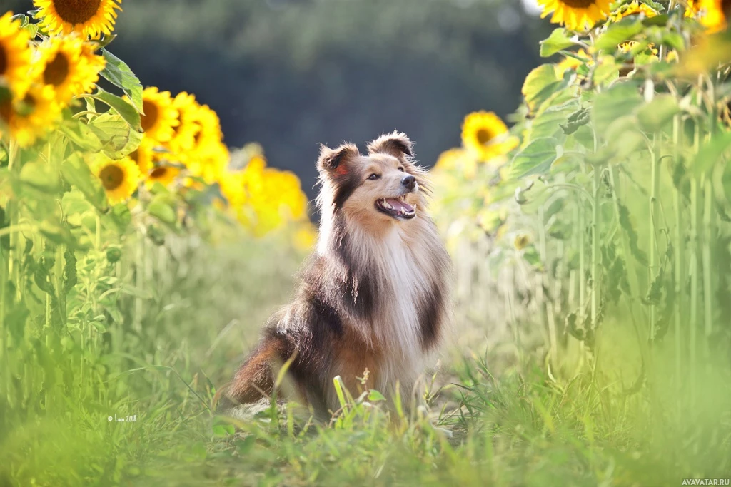 coat pattern. There are sunflowers visible around it, suggesting that this scene takes place in