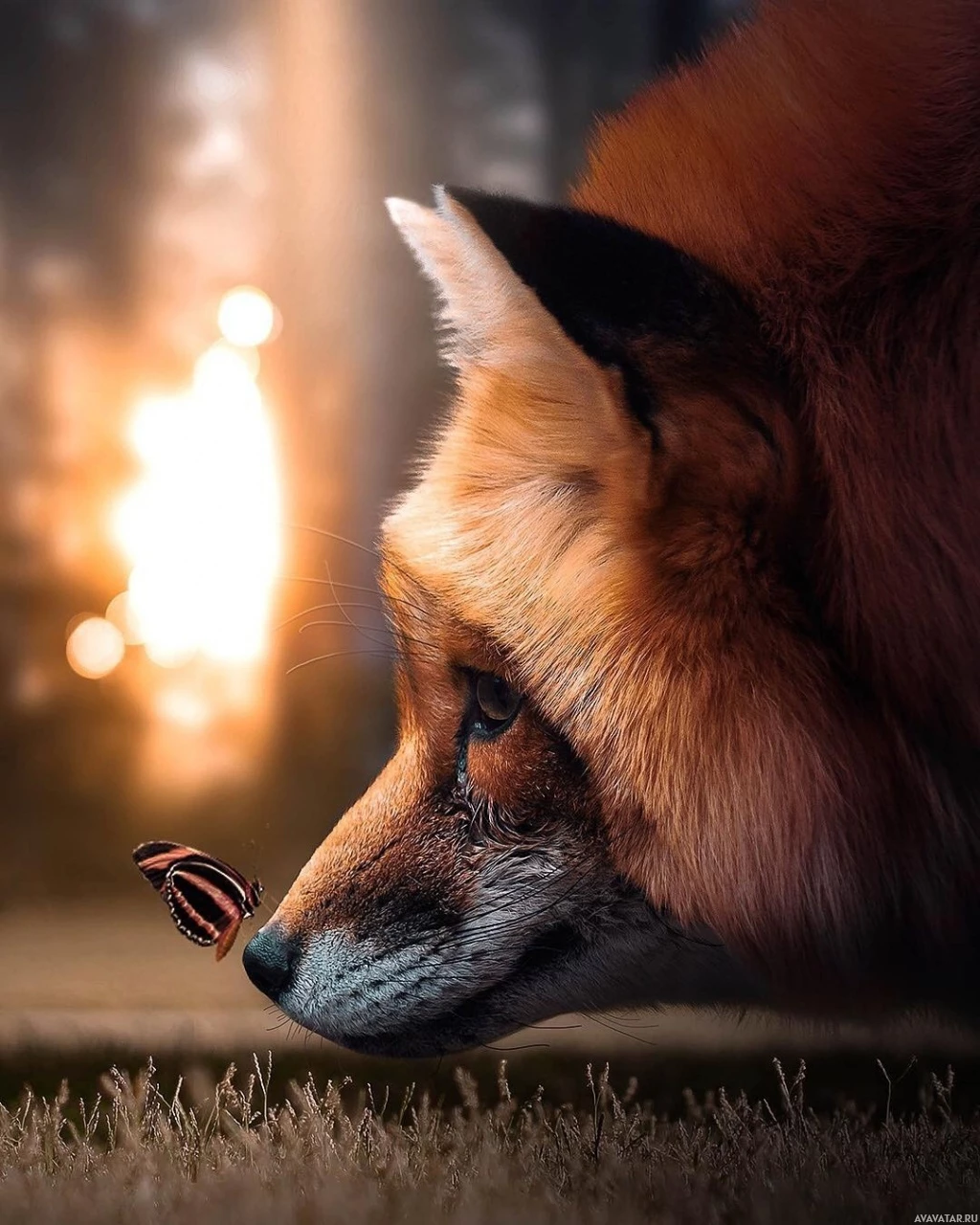 The image shows a fox looking at a butterfly. The background suggests it might be either dawn or dusk, given