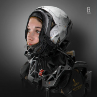 space exploration or high-tech environments. The individual is looking slightly off-camera, suggesting a serious or contemplative demeanor. The overall look is quite advanced compared to typical human attire, which aligns well with the genres of