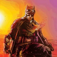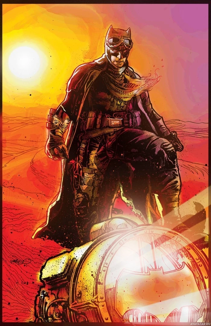 The image depicts a stylized illustration of Batman, a popular comic