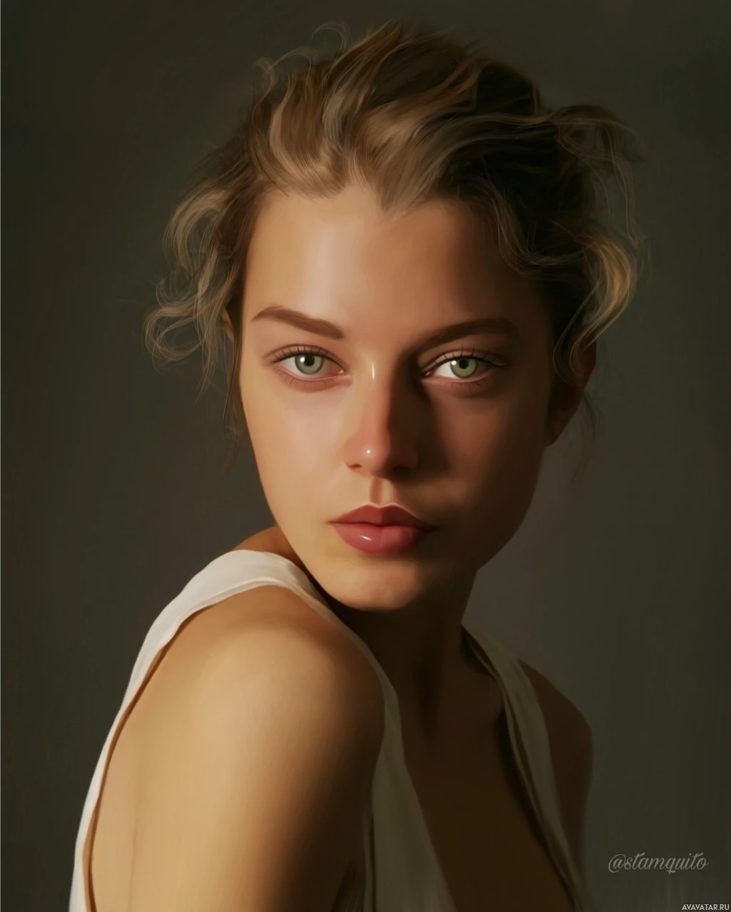 На этом снимке молодая женщина с задумчивым выражением лица смотрит прямо в камеру. У нее светлая кожа и волосы уложены в небрежной манере, не касаясь лица. Фон выполнен в нейтральных тонах, что позволяет ей быть в центре внимания на снимке.