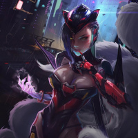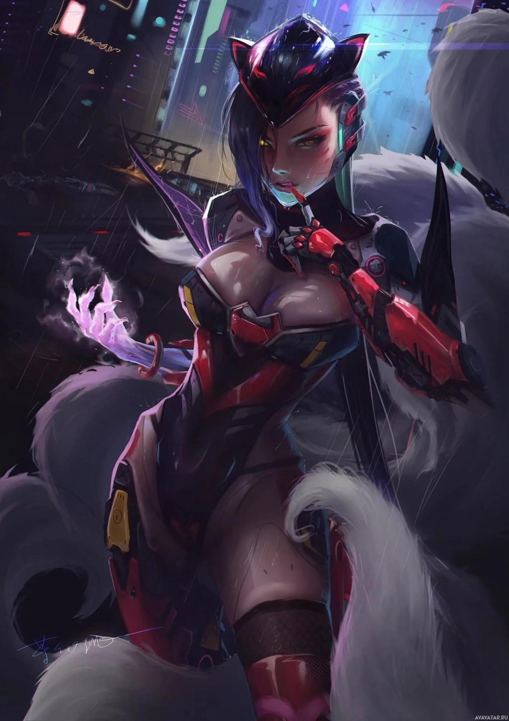an urban environment with neon lights, which could imply that this character is set in a cyberpunk world.