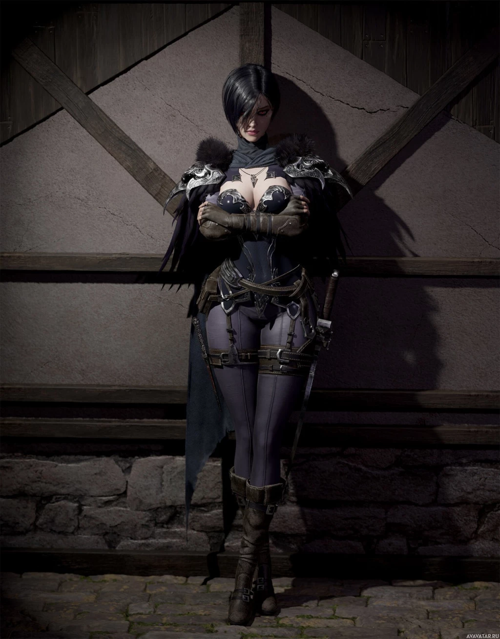 black hair, dressed in fantasy-inspired attire. She's wearing a corset with visible undergarments, pants, and boots, accessorized with what looks like a belt or harness. She is holding a sword sheathed on her side. The character is standing against a backdrop that resembles an old-fashioned wall or gate, suggesting a medieval or fantasy setting.