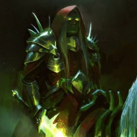 skeletal head. The environment suggests a dark or ominous setting, possibly indicative of a battle or